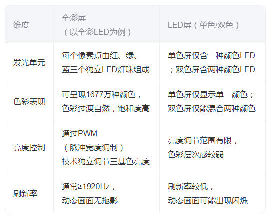 全彩屏和LED屏是显示技术领域常见的两种设备,二者在显示原理、应用场景及技术特性上存在显著差异。